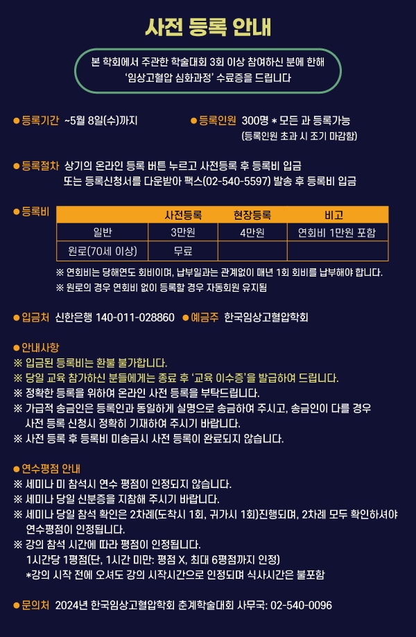 학술세미나 사무국 전화: 02-540-0096 이메일: admin@hypertension-k.org